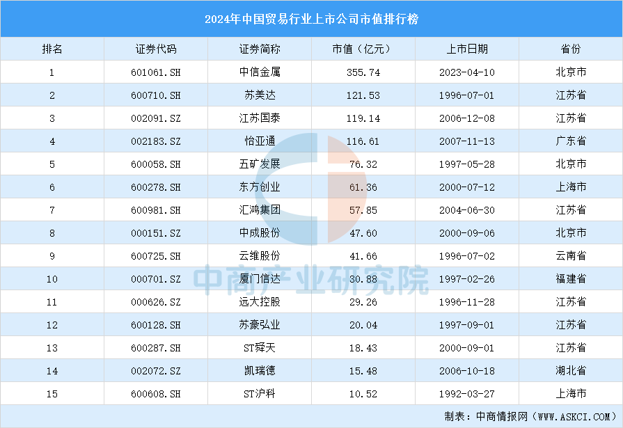 中商谍报网讯:中商财产研究院数据库显示,2024年中国商业行业市值最大的十名上市公司别离是中信金属、苏美达、怡亚通、五矿成长、东方创业、汇鸿集团、中成股份、云维股份和厦门信达。