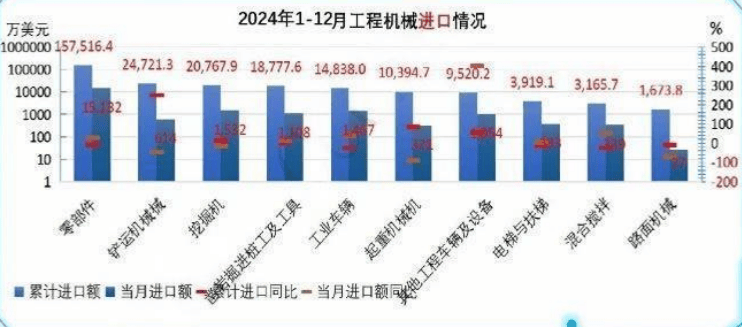 2024年全年出口额同比增加。12月单月出口额同比增加26。4%。工程机械从机出口额达383亿美元,增加12。1%,占总出口额的72。5%。零部件出口额为145。6亿美元,增加1。1%,占总出口额的27。5%。