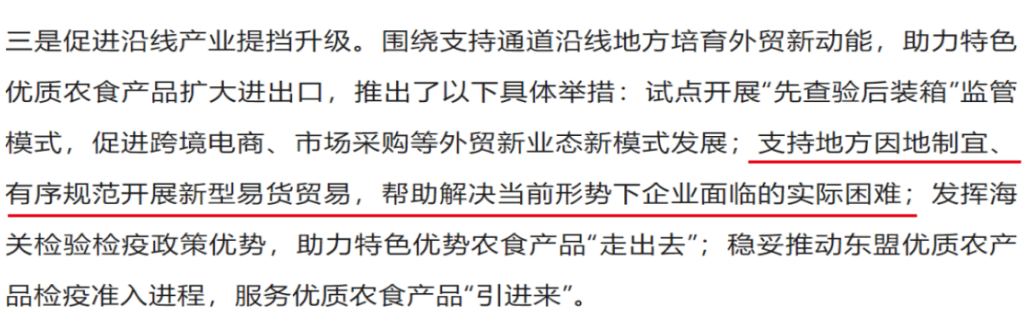 2024年11月12日,国度海关总署正在“海关支撑打制内陆分析枢纽,进一步鞭策西部海新通道扶植”之15条沉点行动中明白提出,支撑处所因地制宜、有序规范开展新型易货商业。